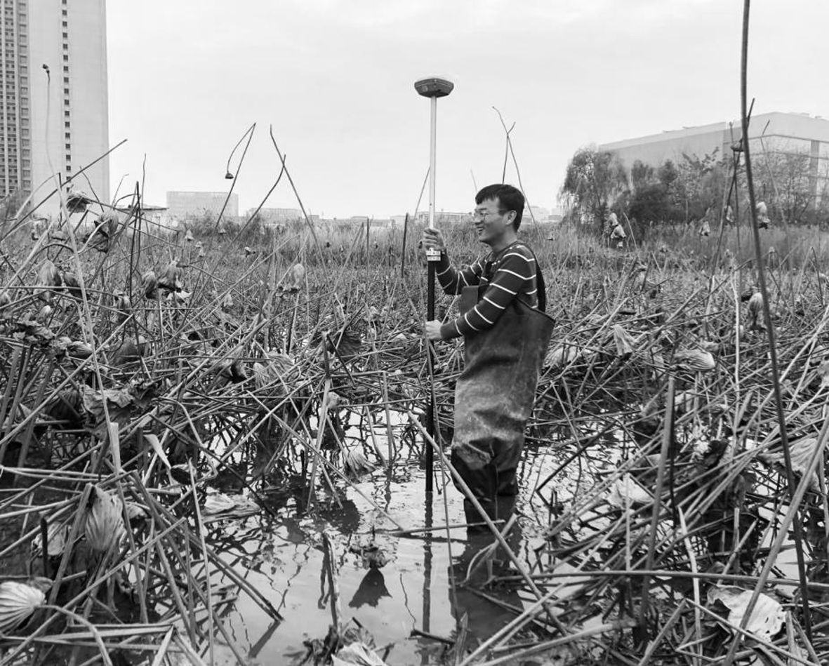 总局江苏局勘研院蔡梁峰顶着高温站在荷花塘中,实施锡北运河水环境综合治理工程测量项目断面测绘。该项目是无锡市锡北运河流域EOD项目的子工程,旨在打造水质改善、人水和谐的绿色发展体系。