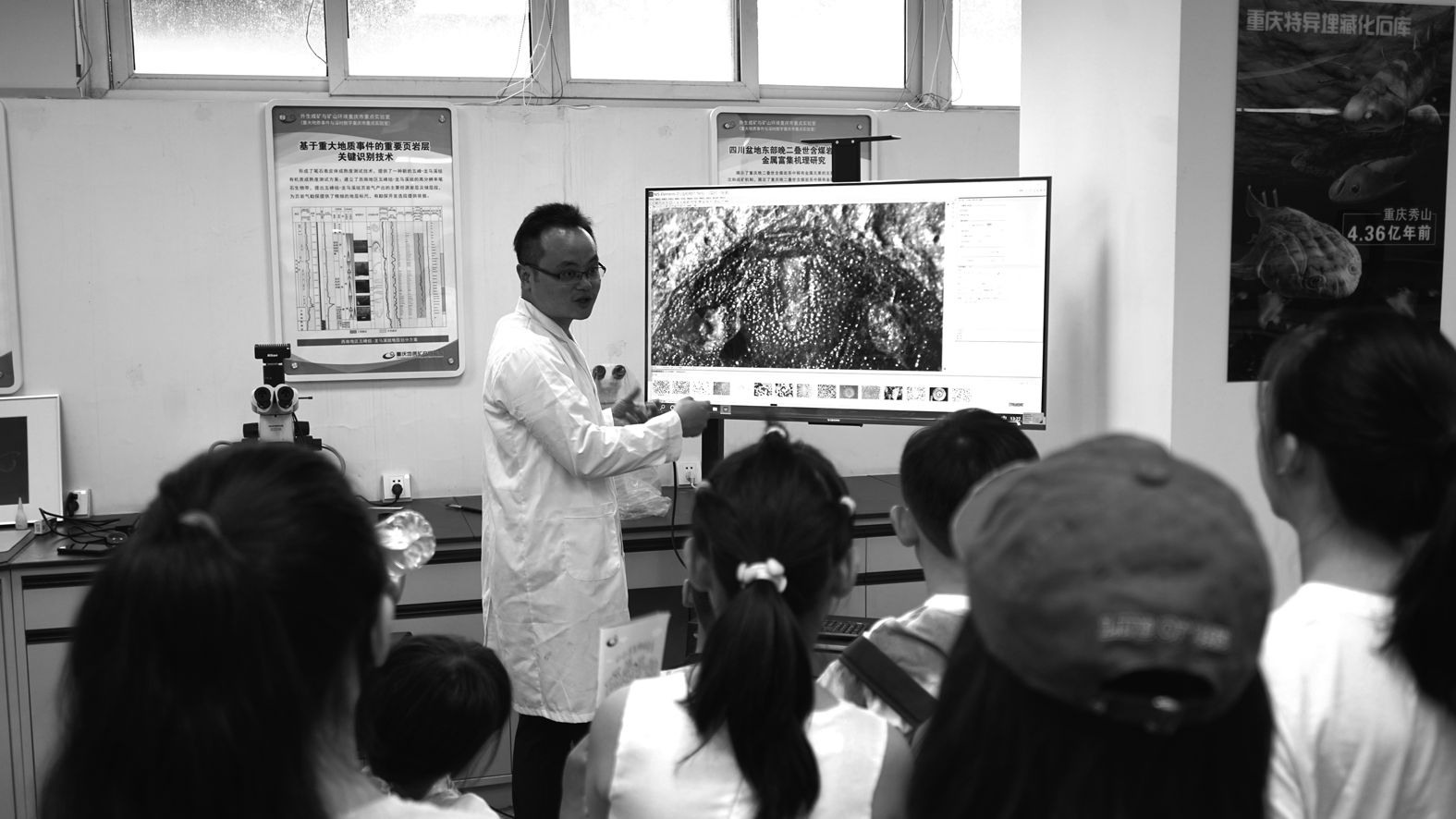 接着,科普讲解员组织同学们参观了依托重庆地研院建设的“重大地质事件与资源环境效应重庆市重点实验室”,该实验室是重庆首个从事地球科学基础研究的重点实验室。该院科技工作者、国家古生物专家陈阳在现场为同学们介绍了寻找、清理、修复化石的相关工作,并指导同学们开展化石清理等科学实践活动。